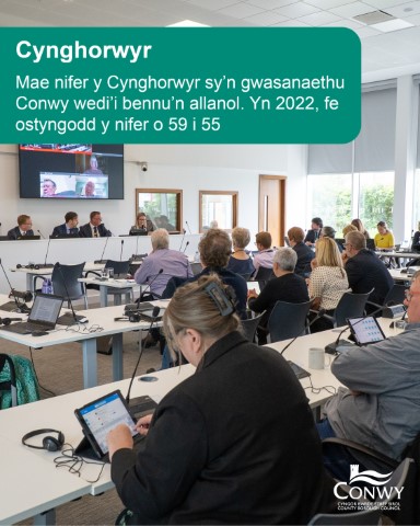 Oeddech chi’n gwybod? NID yw nifer y Cynghorwyr yn cael ei bennu gennym ni, mae’n cael ei bennu’n allanol. Yn 2022, gostyngodd nifer y Cynghorwyr sy’n gwasanaethu Conwy o 59 i 55 fel rhan o adolygiad cenedlaethol.