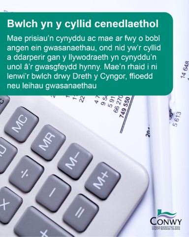 Mae prisiau’n cynyddu ac mae ar fwy o bobl angen ein gwasanaethau, ond nid yw’r cyllid a ddarperir gan y Llywodraeth yn cynyddu’n unol â’r gwasgfeydd hynny. Mae hyn yn creu bwlch yn y cyllid cenedlaethol. Er mwyn cynnal gwasanaethau hanfodol, rhaid i ni bontio’r bwlch trwy Dreth y Cyngor, cynyddu ffioedd neu leihau gwasanaethau.