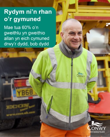Oeddech chi’n gwybod? Mae tua 60% o’n gweithlu yn gweithio allan yn eich cymuned bob dydd. O gasglu gwastraff i gynnal a chadw priffyrdd i ofal cymdeithasol a chymorth cymunedol, mae ein timoedd allan yn y llefydd sy’n bwysig.