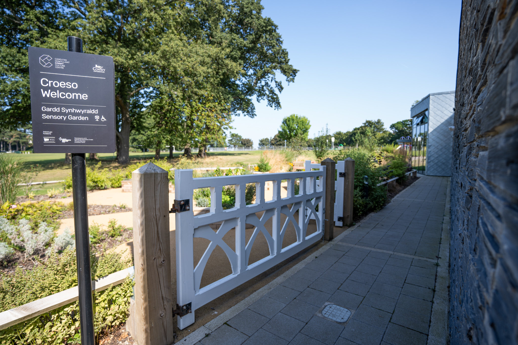 Mae’r mannau sydd wedi’u tirlunio o amgylch y ganolfan yn cynnwys gardd synhwyraidd heddychlon gyda llwybrau a seddi hygyrch sy’n ystyriol o bobl â dementia. Gallwch wrando ar leisiau lleol yn adrodd eu hanesion wrth i chi edmygu'r planhigion meddyginiaethol yn yr Ardd Berlysiau, sy'n cydnabod hanes mynachaidd cyfoethog Conwy cyn y castell.