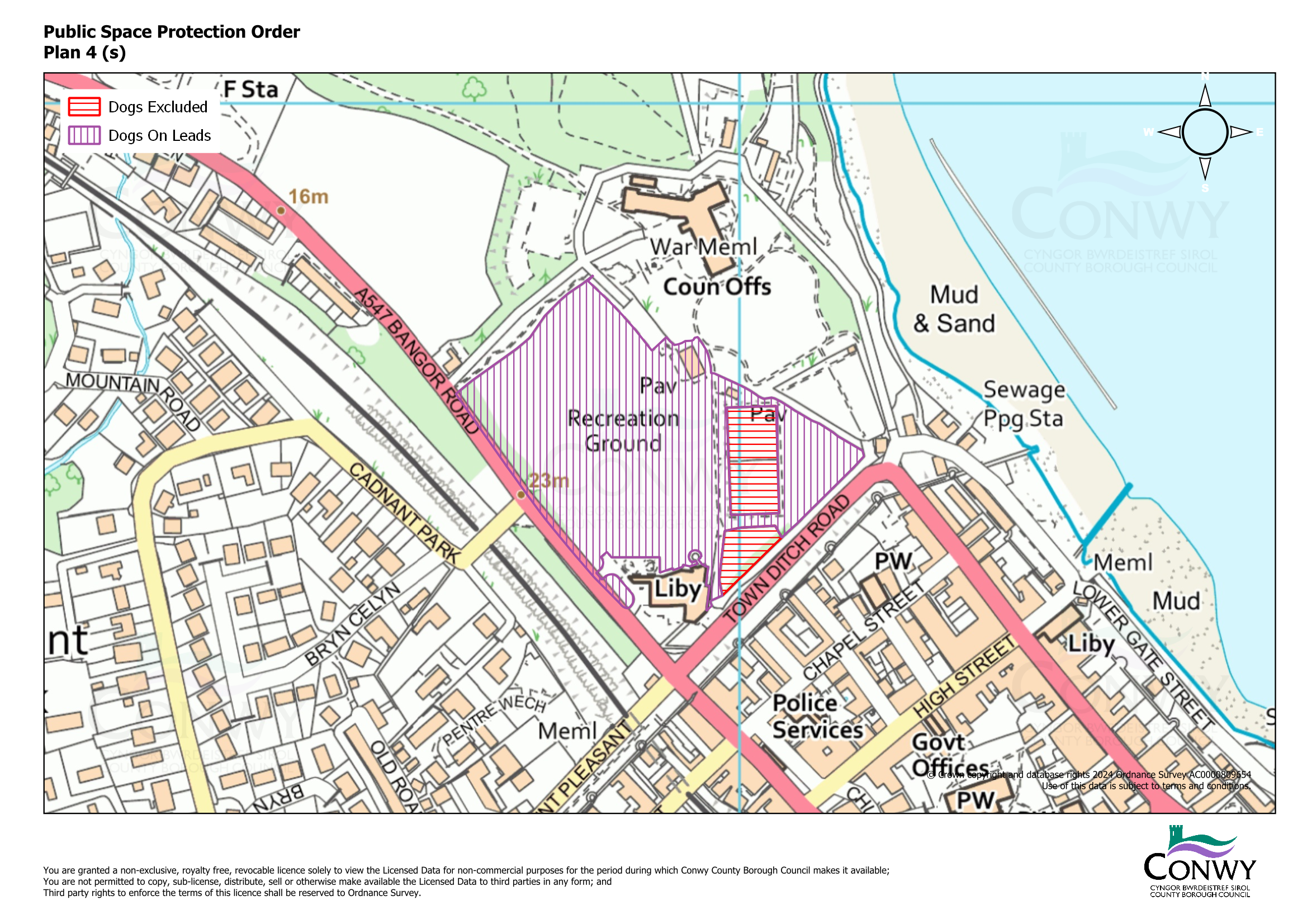 - Keep your dog on a lead at all times in the area of Bodlondeb park containing the football pitch, cricket pitch and tennis courts, as shown in purple on the map.